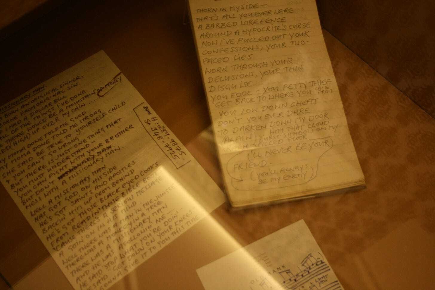 There were costumes and ephemera like posters, but the highlight for me was the little desk (with drawers that you could open as if you really were at her desk) with notebooks and scraps of paper with lyrics and music and little notes-to-self. I didn’t take many photos, but I absolutely love this one, because it reminds me that even Annie Lennox has to go right back to the beginning when she’s trying to find a word: